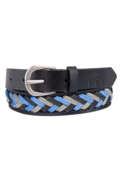 Der Flechtgürtel ist mit einem schwarzen Leder, einer silbernen Schnalle sowie einem geprägten Logo ausgestattet.