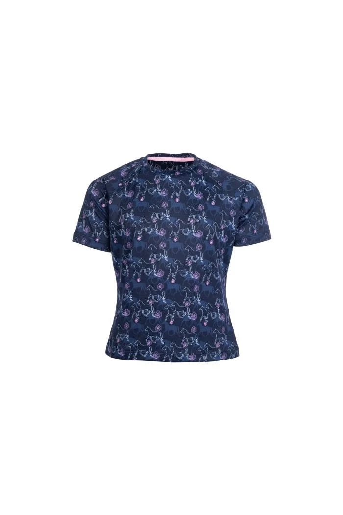 Das dunkelblaue Shirt Bria sticht durch das aufwendige Muster aus trabenden Pferden und floralen Elementen heraus. Der große Baumwollanteil ist zudem sehr angenehm auf der Haut und kann durch den taillierten Schnitt optimal getragen werden.