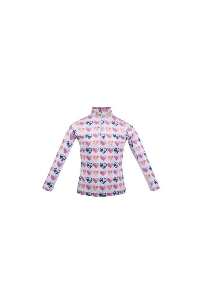 Das Shirt kann dank der Funktionsfaser eine gute Feuchtigkeitsaufnahme ermöglichen. Die Einsätze aus Meshgewebe können außerdem für eine hohe Atmungsaktivität sorgen, welche vor allem beim Reiten wichtig ist. Der kurze Reißverschluss vorne kann das An- und Ausziehen des Funktionsshirts für Kinder erleichtern. Mit dem Print aus Herzen und Pferden wird das Shirt zum richtigen Hingucker. Erhältlich ist es in den trendigen Farben Weiß/Pink.