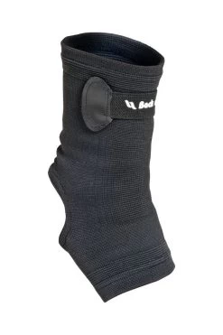 Der Fußgelenkschoner von Back on Track hat ein elastisches Spannband an der Oberkante. Dieses wird von zwei Klettverschlüssen gehalten. Es kann nach Bedarf eng gespannt oder auch abgenommen werden.