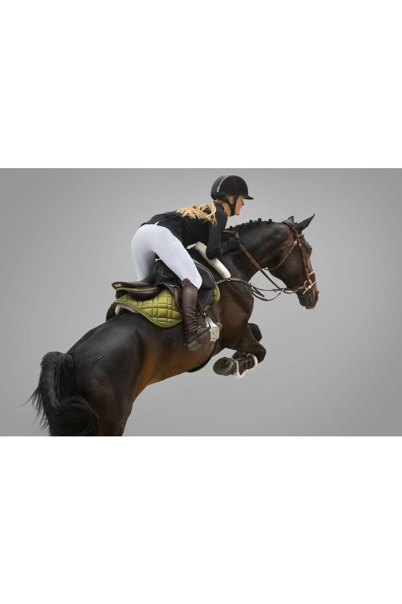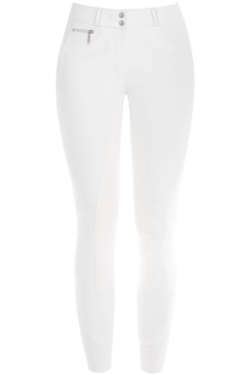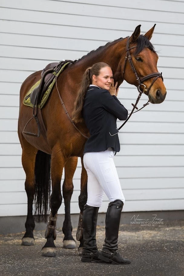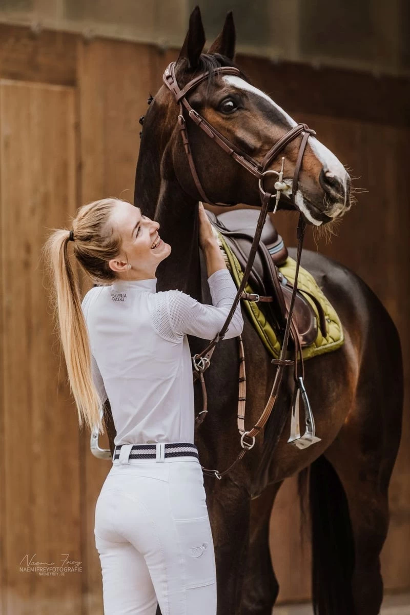 Mit ihren kleinen Details soll sie Dir auf jedem Reitsport-Turnier Glück bringen – der Reißverschluss ist mit drei kleinen Kleeblättern verziert und auch unser beliebtes Pferdekopf-Logo wünscht Dir mit seiner vierblättrigen Kleeblattverzierung “Alles Gute”. Für einen optimalen Halt im Sattel ist die RidersChoice Reithose in weiß mit einem gleichfarbigen Kunstleder ausgestattet. Überzeugen kann die weiße Turnierreithose für Damen aber nicht nur durch ein gutes Mindset, sondern auch durch ihren hohen Tragekomfort und qualitativ sehr hochwertigen Stoff. Egal ob im Frühjahr bei noch etwas frostigen Temperaturen oder im Sommer bei schönstem Sonnenschein – durch ihren klimaregulierenden und atmungsaktiven Stoff begleitet Dich DIE Glücks-Reithose mit Kunstledervollbesatz durch die komplette Turniersaison. Unsere Empfehlung für kurze und lange Turniertage!