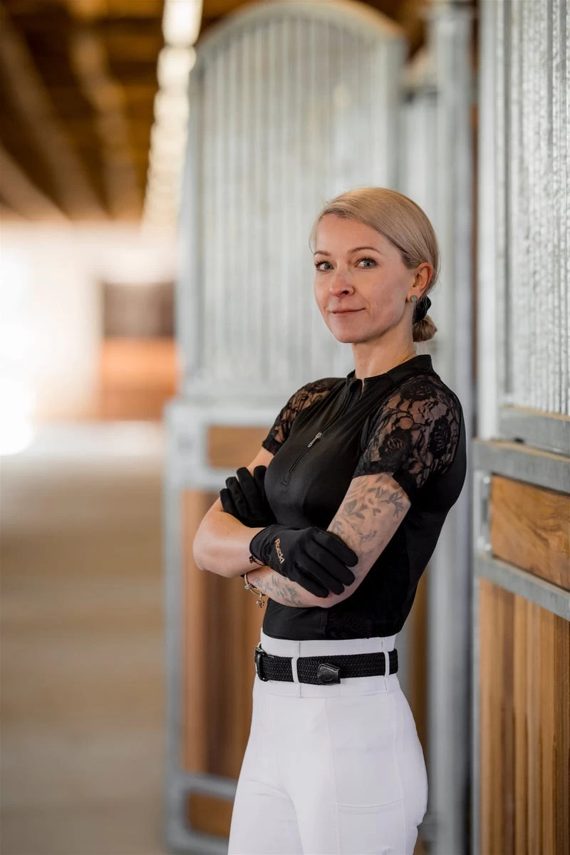 Die Glücks-Reitleggings besteht aus unserem bewährten Turnier-Reithosenstoff, welchen Du eventuell schon von unseren Glücks-Reithosen oder weißen Glitter Design Modellen kennst. Aufgrund der Blickdichte ist es leider nicht möglich den selben Stoff der Reitleggings Classic Design zu verwenden. Den Bund der Turnier-Reitleggings haben wir auf dieselbe Höhe der Glücks-Reithose angepasst.