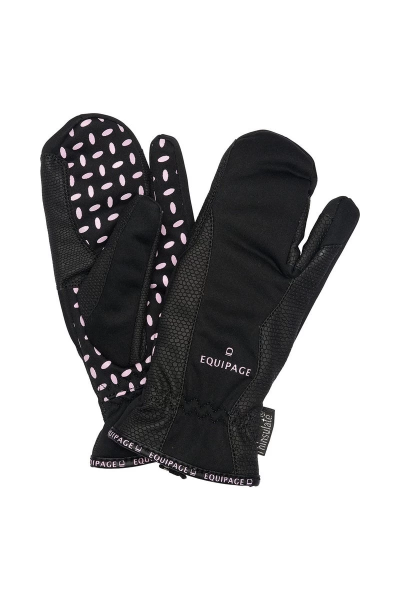 - Warmer 3-Finger-Handschuh mit rosafarbenem, reisförmigem Silikon-Grip-Aufdruck auf der Handfläche. Band in Lederoptik am oberen Rand mit rosafarbenem EQUIPAGE-Logo für auffällige Girlie-Details. Effektgewebe aus 60 % Polyestergewebe mit 40 % PU-Beschichtung.