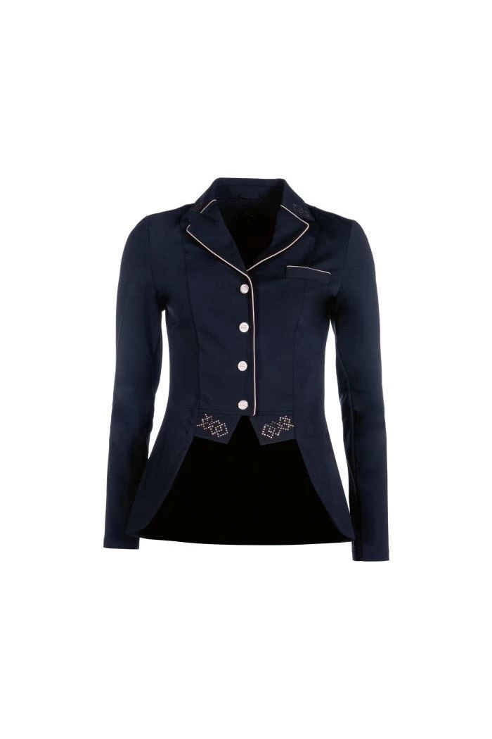 Es überzeugt durch den atmungsaktiven und elastischen Stoff, welcher sich durch den taillierten Schnitt gut anpassen kann. Verschließen kannst Du ihn mit einer eleganten silbernen Knopfleiste. Die seitlich eingearbeiteten Reitschlitze können für die nötige Bewegungsfreiheit beim Reiten sorgen. Das Kurzfrack für Damen hat ein geometrisches Emblem und wurde mit Strasssteinen am Kragen und auf Vorder- und Rückseite des Fracks versehen, welche für ein besonderes Highlight sorgen können. Erhältlich ist es in den typischen Turnier Farben Dunkelblau und Schwarz.
