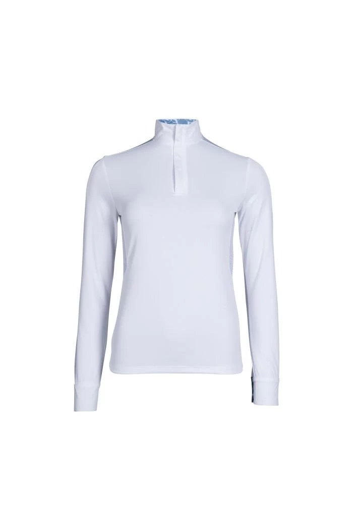 Es besticht durch den auffällig hellblauen Print mit kleinen weißen Musterungen. An den Ärmeln und auf der Rückseite verfügt das Shirt über Einsätze aus Meshgewebe, die besonders atmungsaktiv sein können. Das elastische Material des Funktionsshirts für Damen und der taillierte Schnitt können dafür sorgen, dass das Shirt einen besonders angenehmen Tragekomfort hat. Der kurze Reißverschluss vorne kann beliebig offen oder geschlossen getragen werden. Das Shirt kann ein schlichtes Reitoutfit optimal aufwerten.