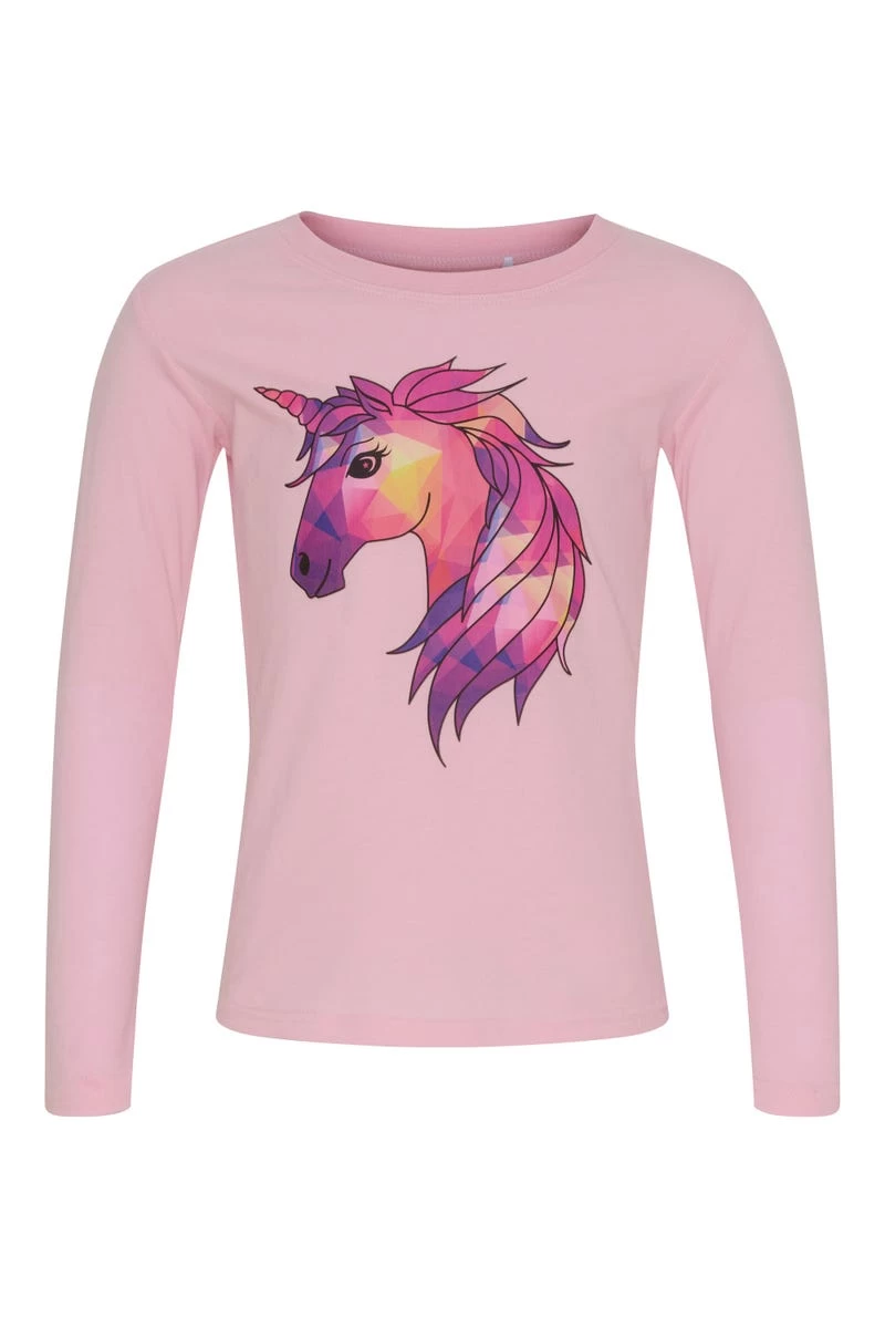 - Basic-Langarm-Shirt mit Rundhalsausschnitt aus einem schönen Baumwoll-Polyester-Mix-Jersey. 2 verschiedene Frontprints – Fairy Tale Version mit buntem Einhorn und Navy Version mit metallisch schimmerndem Text.