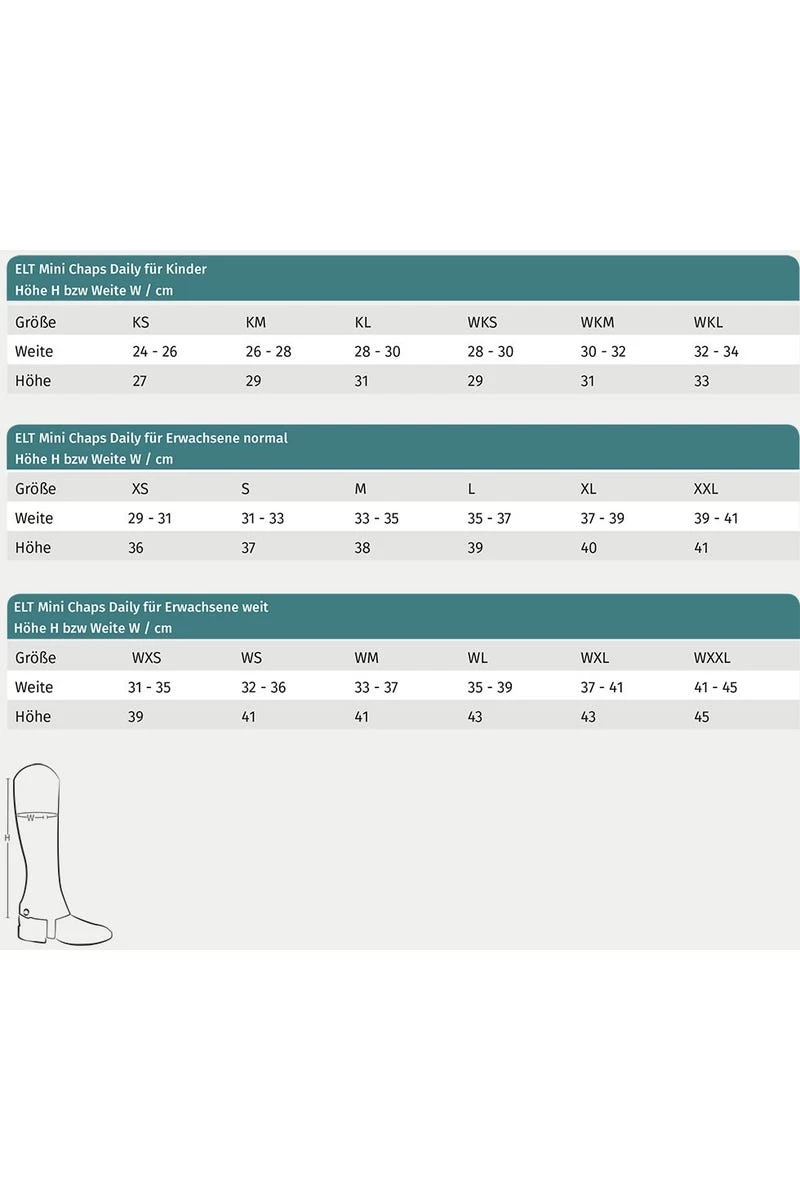 - Elastische Mini Chaps mit exzellenter Passform und Silikon-Grip, Integrierte lange, elastische Einsätze, Stabiler Reißverschluß mit Druckknopfabschluss, Elastische Schuheinsätze vorne, Elastische, verstärkte Stege, Größe