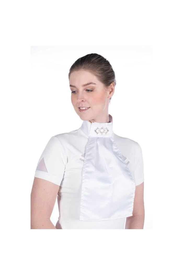 Der Pastron Abby ist mit feinen rosegoldenen Strasssteinen am Stehkragen besetzt, welche für einen Eyecatcher sorgen können. Mit dem Plastron lässt sich Dein Turnieroutfit schnell und einfach optisch aufwerten. Der Kragen lässt sich hinten problemlos durch einen Klettverschluss einfach und schnell verschließen.