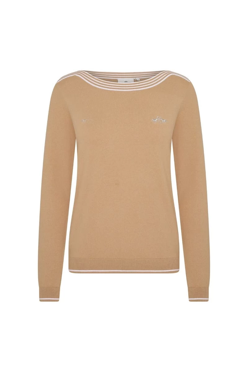 - Geformter, gestrickter Damenpullover mit sportlicher Rippung am U-Boot-Ausschnitt und Streifen in Kontrastfarbe. Der Streifen findet sich auch in der Seitennaht, an den Bündchen und der unteren Rippung. Kleine, luxuriöse Logo-Stickerei auf der Brust.