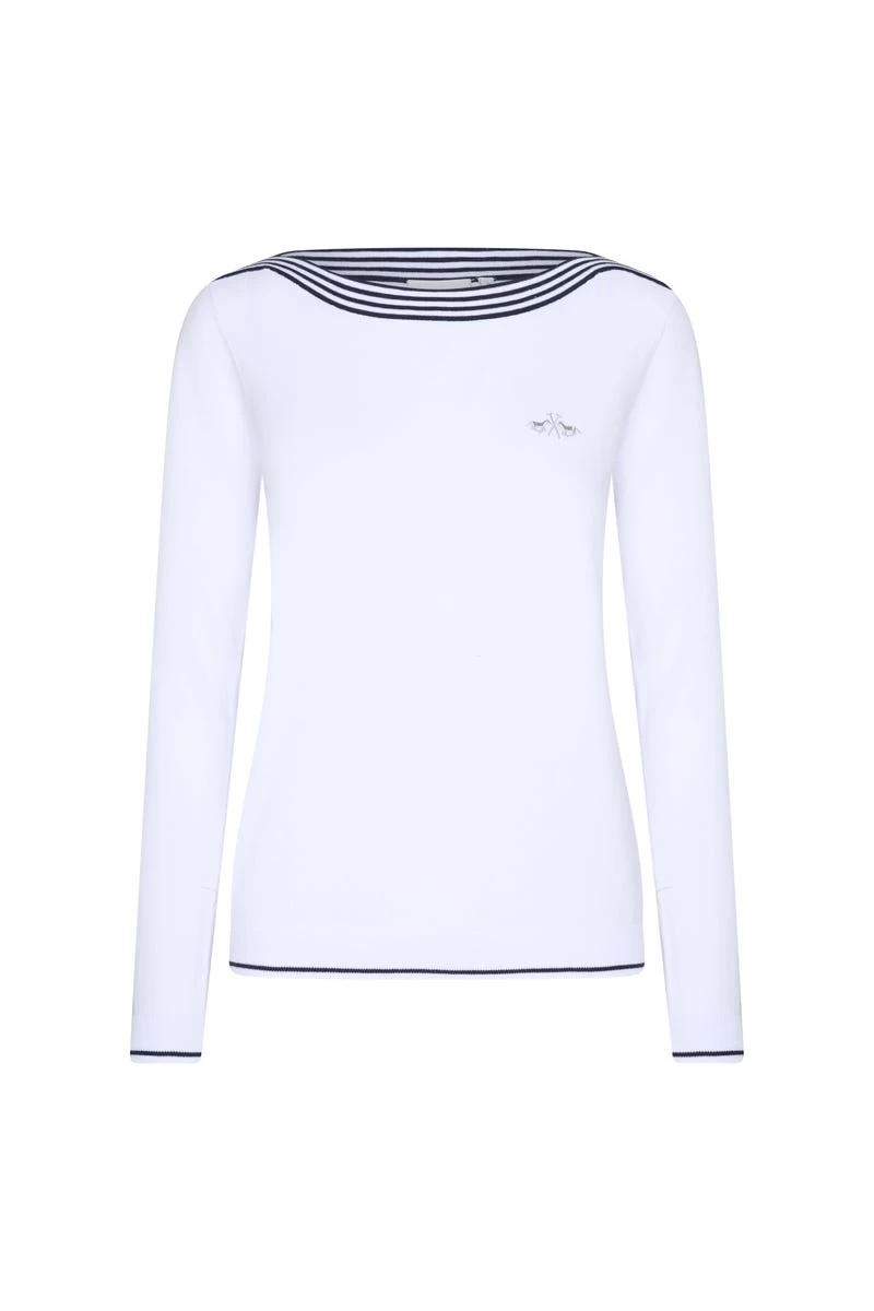 - Geformter, gestrickter Damenpullover mit sportlicher Rippung am U-Boot-Ausschnitt und Streifen in Kontrastfarbe. Der Streifen findet sich auch in der Seitennaht, an den Bündchen und der unteren Rippung. Kleine, luxuriöse Logo-Stickerei auf der Brust.