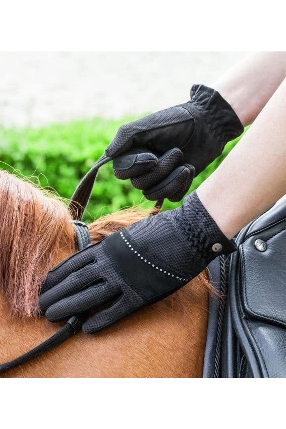 Die dezente Verzierung mit Strasssteinchen auf dem Handrücken des Reithandschuhs sorgt optisch für einen echten Hingucker.