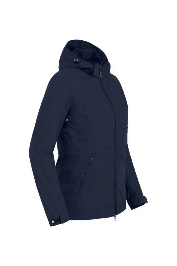 Die Damenreitjacke hat ein atmungsaktives, wasserdichtes und winddichtes Material.