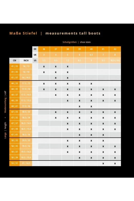 - Größenangabe: Schuhgröße/Wadenlänge/Wadenumfang
