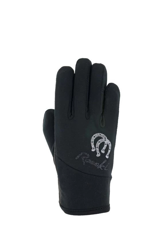 Das Design wird pferdeverrückten Kids gefallen: Die Oberhand zieren silbern funkelnde Hufeisen sowie das ROECKL Logo in aufwendigem Glitzerdruck – Letzteres bei der Farbstellung Schwarz-Violett sogar in femininer Schreibschrift.