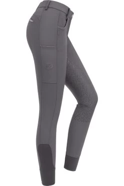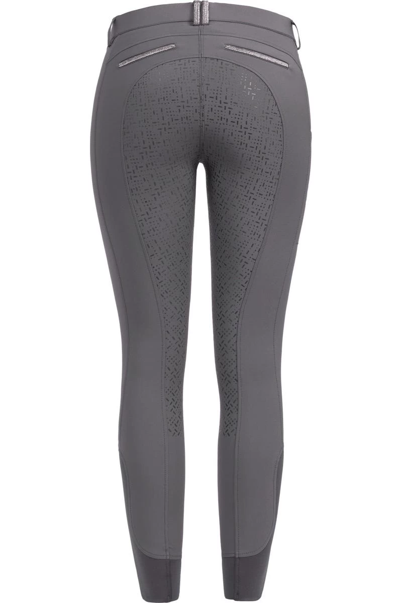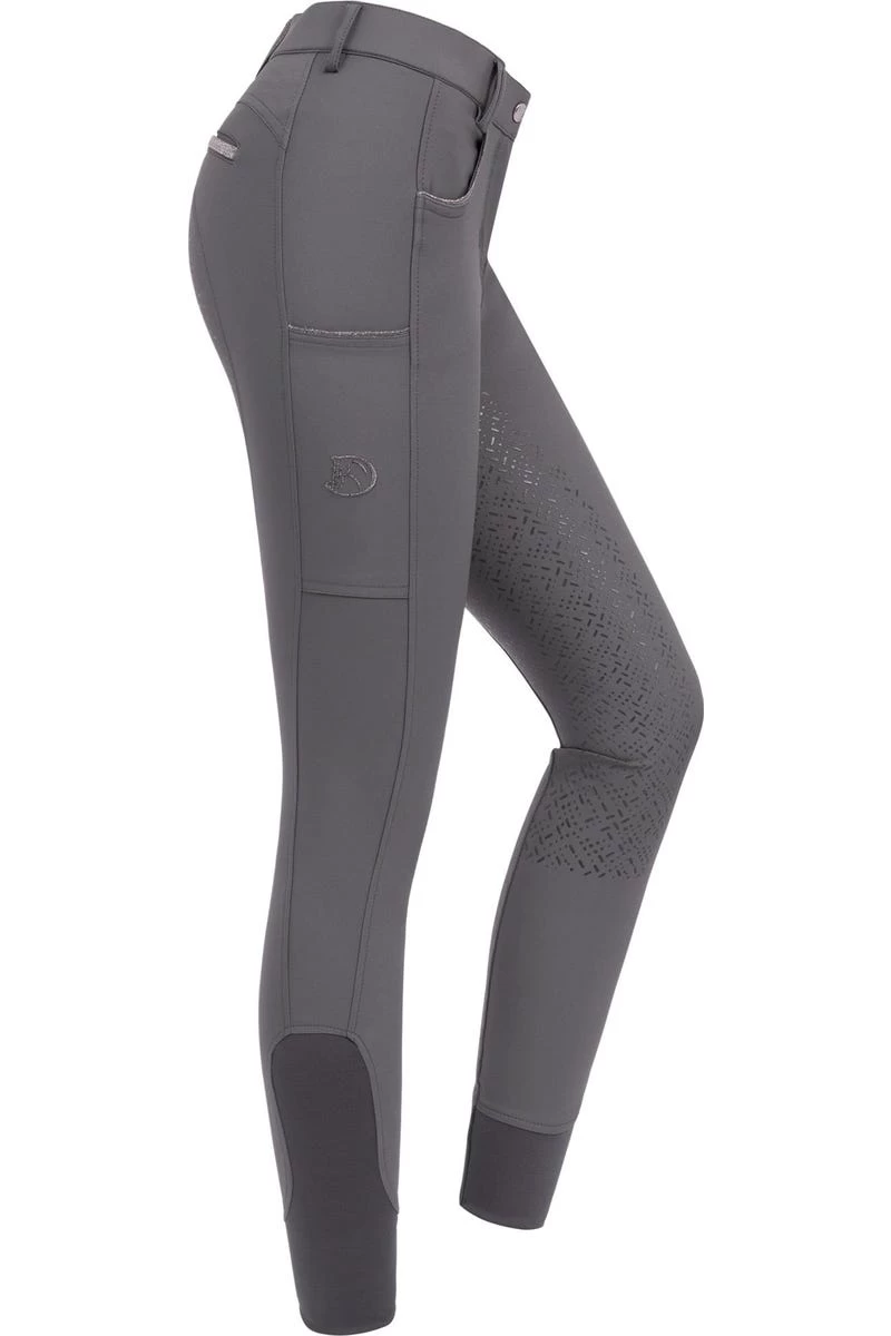 Das weiche Material schmiegt sich wie eine zweite Haut an Deinen Körper an, ist dabei angenehm zu tragen und schränkt Dich in Deiner Bewegung nicht ein. Der elastische Beinabschluss der Reithose für Damen ermöglicht einen komfortablen Sitz und sorgt dafür, dass sie nicht nach oben rutscht. Durch die praktischen Seitentaschen kannst Du Dein Handy oder andere Kleinigkeiten leicht verstauen. Das Pferdekopf-Logo ist in schlichter Ton in Ton Optik gehalten. Dezente Glitzerelemente an den Taschen runden Dein Outfit für den Stallalltag ab.