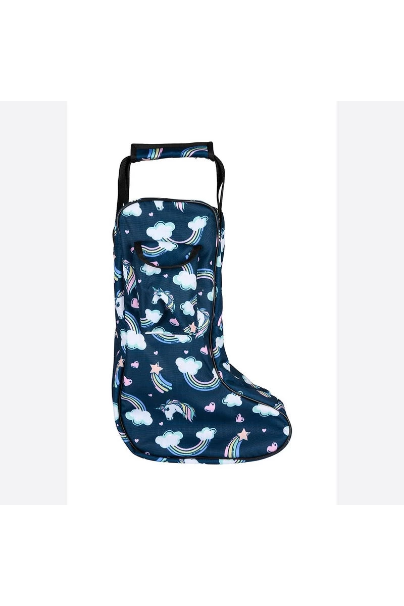 - Kinderstiefeltasche aus 600D Ripstop-Material. Allover-Print mit Einhörnern, Regenbogen & Herzen in fröhlichen Farben. 1 Außentasche. Gurtgriffe und Schultergurt. EQUIPAGE Logo-Emblem aus Gummi am Griff.