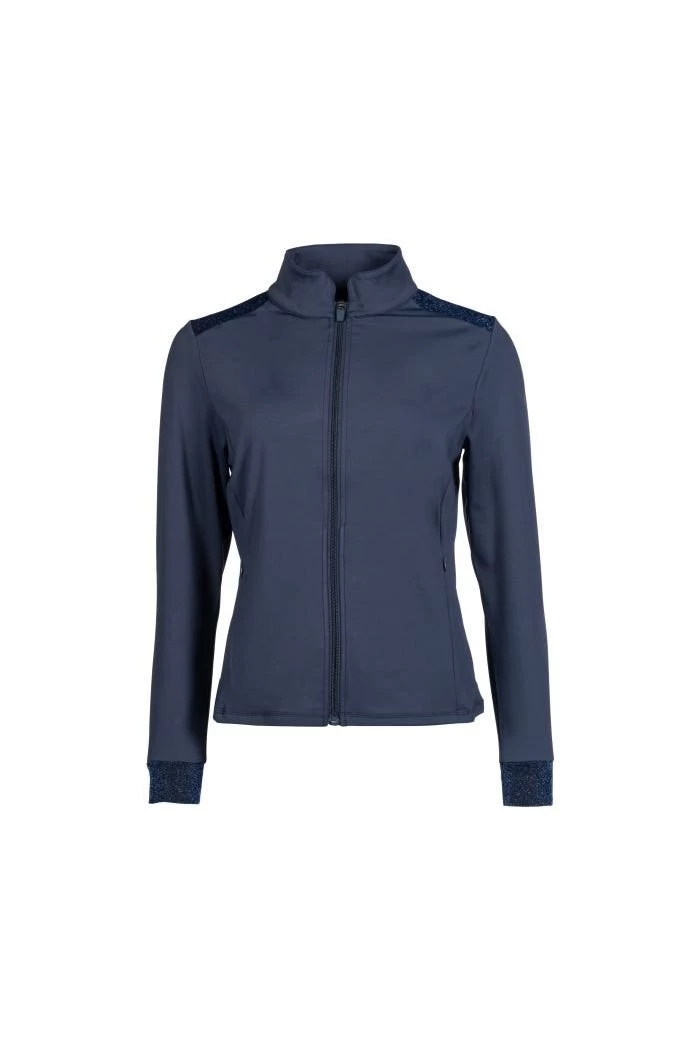 Die Jacke eignet sich nicht nur als Überziehjacke auf Turnieren, sondern macht auch im Alltag eine gute Figur. Aufgrund ihres modischen Designs im klassischen Dunkelblau mit dezenten Glitzerelementen an der Schulterpartie sowie am Ärmelabschluss verleiht sie der schlichten Jacke die nötige Eleganz. Dank des elastischen Stoffs der Sweatjacke für Damen kann sie besonders bequem getragen werden. Sie wurde vorne mit zwei Taschen ausgestattet, die mit Reißverschlüssen geschlossen werden können.