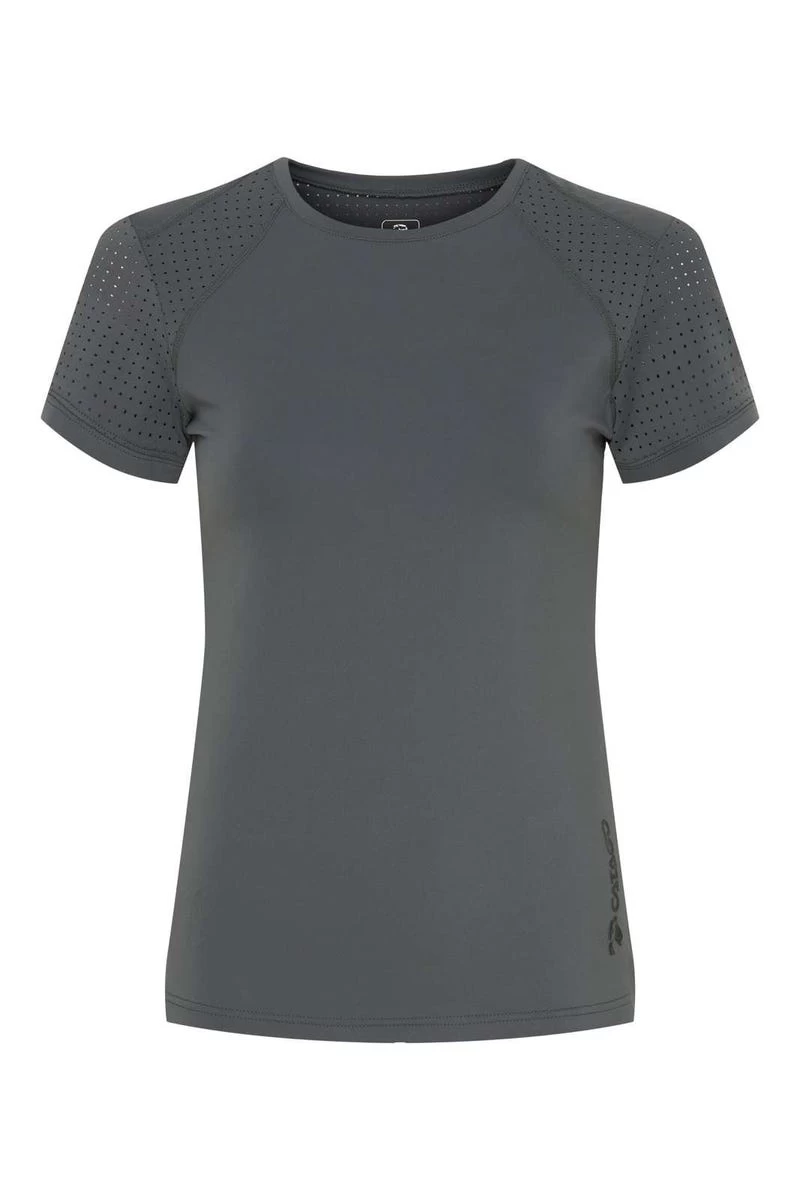 - Eng anliegendes T-Shirt aus atmungsaktivem und feuchtigkeitsabsorbierendem Gewebe. Lasergeschnittenes perforiertes Material an Vorder- und Rückeneinsatz sowie am Ärmel. Catago-Logo am unteren Saum. 78% Polyamid 22% Elasthan.