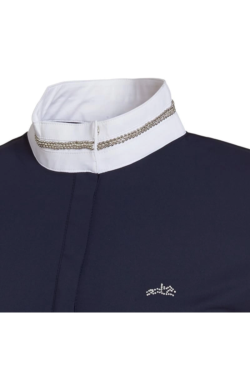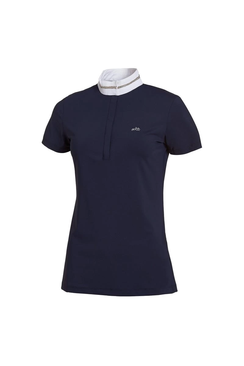 Hochwertiges, funktionales Turniershirt für Damen im schlichten Design mit edlen Akzenten. Das Shirt ist atmungsaktiv, schnell trocknend und hat einen UV-Schutz. Der vordere Reißverschluss ist verdeckt. Eine edle Perlenkette am Kragen sorgt für dezenten Glamour.