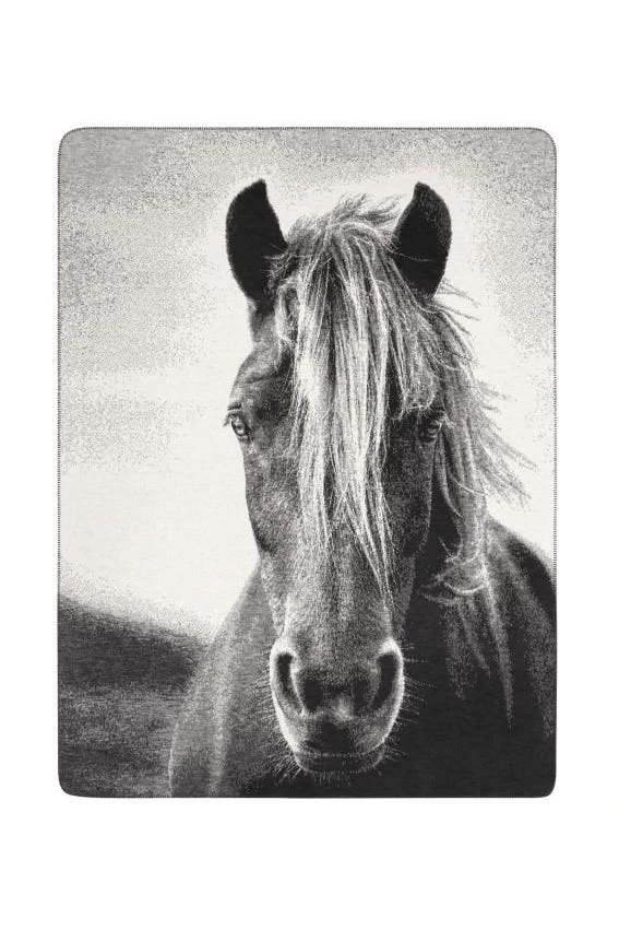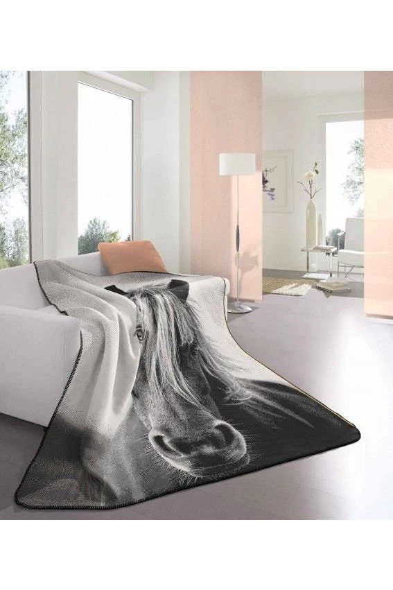 Sie ist mit einem großen Pferdemotiv geschmückt. Zudem ist die anthrazitfarbene Kuscheldecke komplett mit einem Häkelsaum eingefasst.