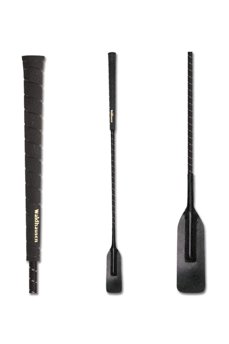 Die hochwertige Springgerte ist mit einem bewährten Spezialgriff, einem leichten Fiberglaskern und einer beiten Lederklatsche versehen.