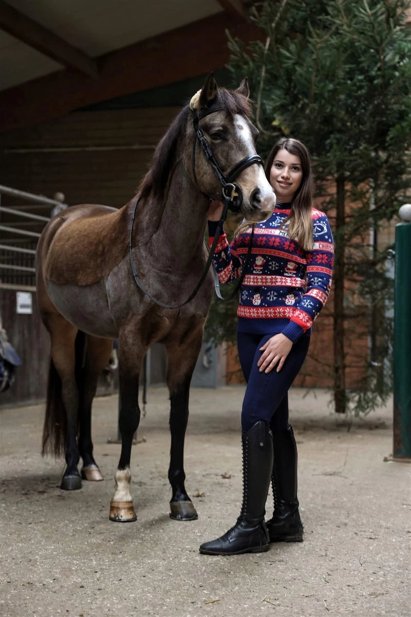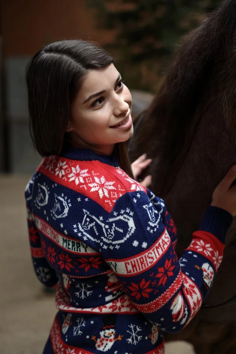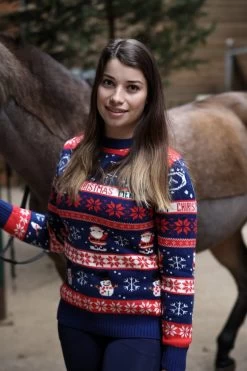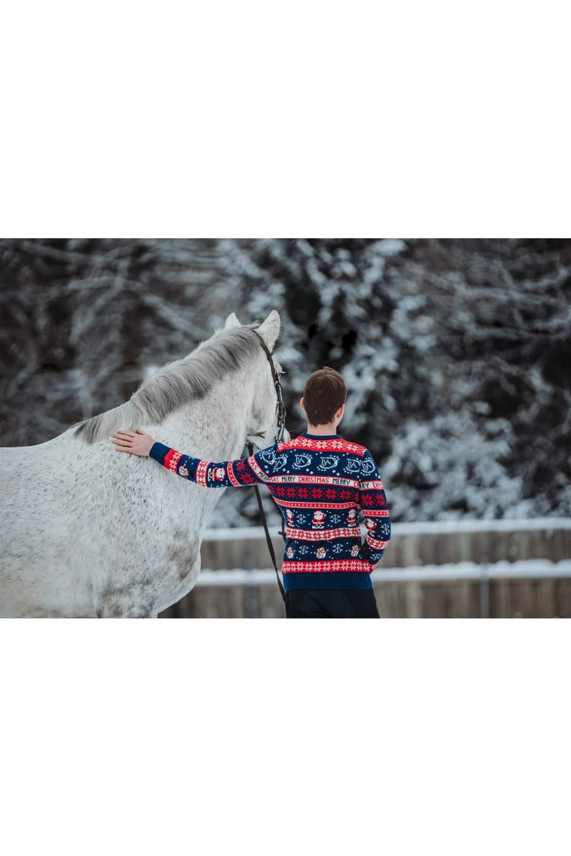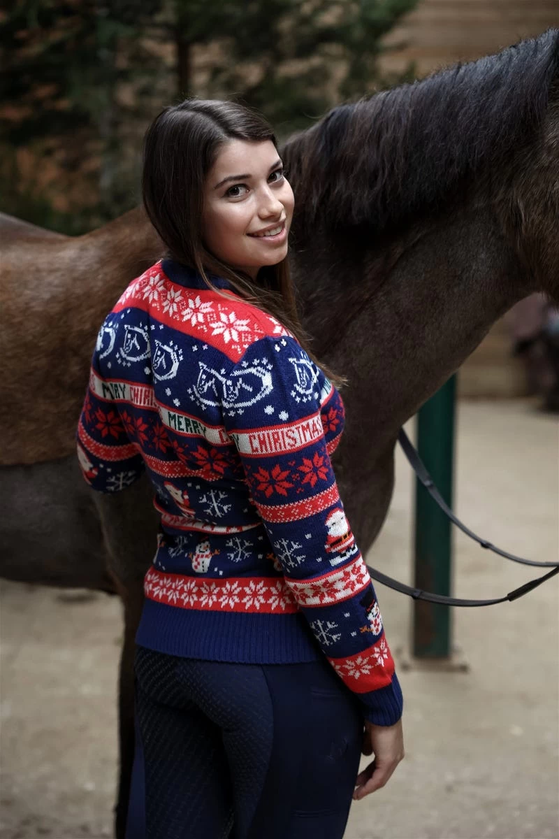 Weihnachtlicher wird es dieses Jahr bei RidersChoice nicht mehr. Der Strickpullover für Damen vereint tolle winterliche Motive wie Weihnachtsmänner, Schneeflocken und Schneemänner und lässt die Herzen von Weihnachtsliebhabern höherschlagen. In das weihnachtliche Design wurden ebenfalls der Pferdekopf von RidersChoice sowie der Schriftzug „Merry Chiristmas“ eingearbeitet. Er besitzt Rippbündchen an Ärmeln, Saum und Ausschnitt, welche ein Verrutschen des Pullover verhindern. Das weiche und angenehme Material sorgt für einen hohen Tragekomfort und hält Dich an kühleren Tagen warm. Auch als Geschenk eignet sich der Pullover wunderbar, um Deinen Liebsten ein Lächeln ins Gesicht zu zaubern.