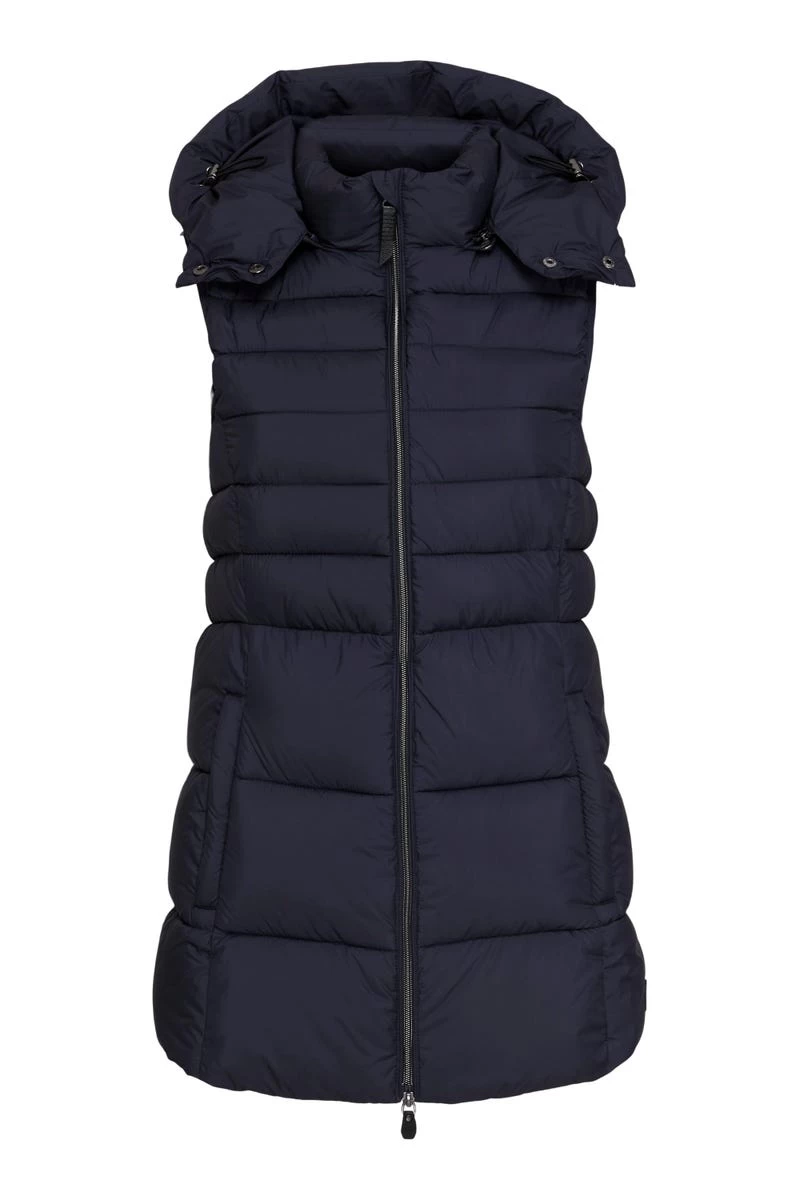 - Taillierte Weste in bauschiger Optik mit horizontalen Steppeinsätzen. Voluminöser Kragen und abnehmbare Kapuze. Kleines zartes schwarzes Logo-Gummiabzeichen. Glänzender Spiralreißverschluss in Gun Metal Farbe. Schwarzer Reißverschluss-Pullerriemen aus schönem Lederimitat.